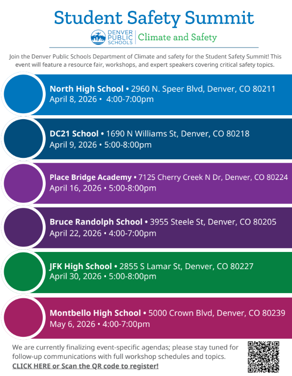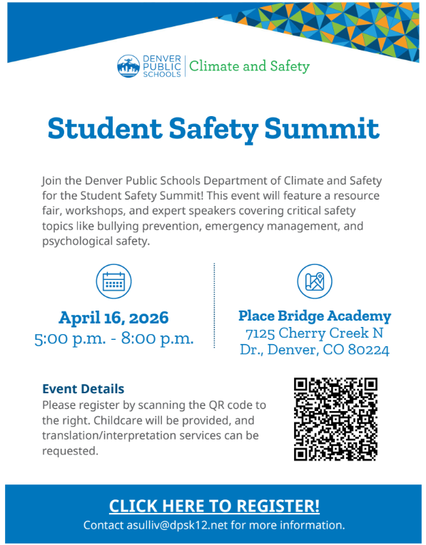Denver Public Schools invites families to attend the upcoming Student Safety Summits hosted by the Department of Climate and Safety.