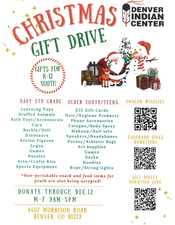 So many beautiful ways to connect, give back, and support our youth this season. The Denver Indian Center is hosting a winter gathering, a Christmas gift drive, and ongoing youth programs for families.
